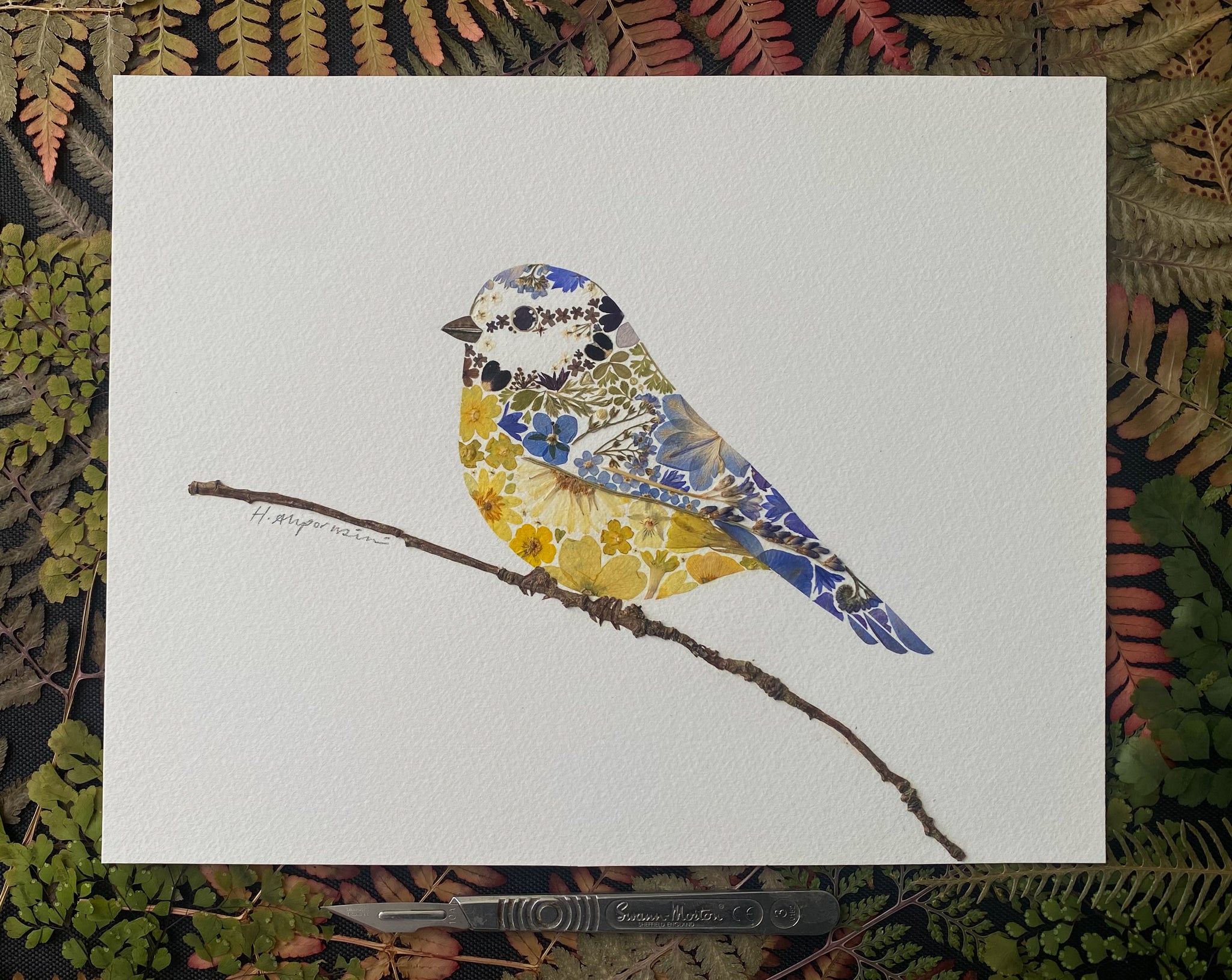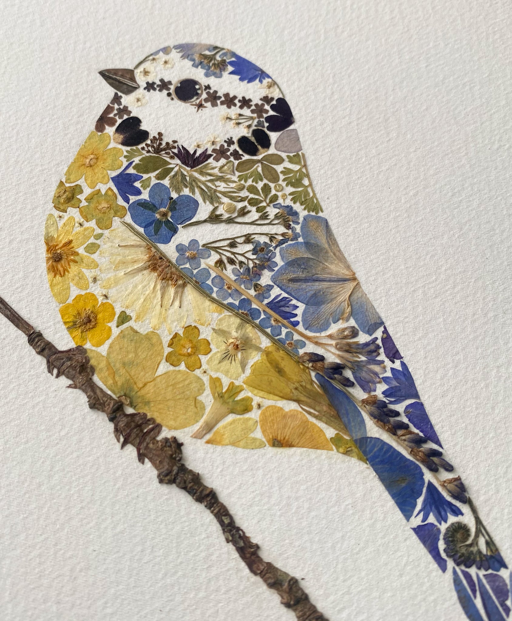 A charming blue-tit with delicate floral details perched upon a branch. Please note this artwork contains cowslip which sometimes turn a light shade of green with age. This piece was made in 2024 and the cowslips are still yellow with a hint of green. This is reflected in the price.