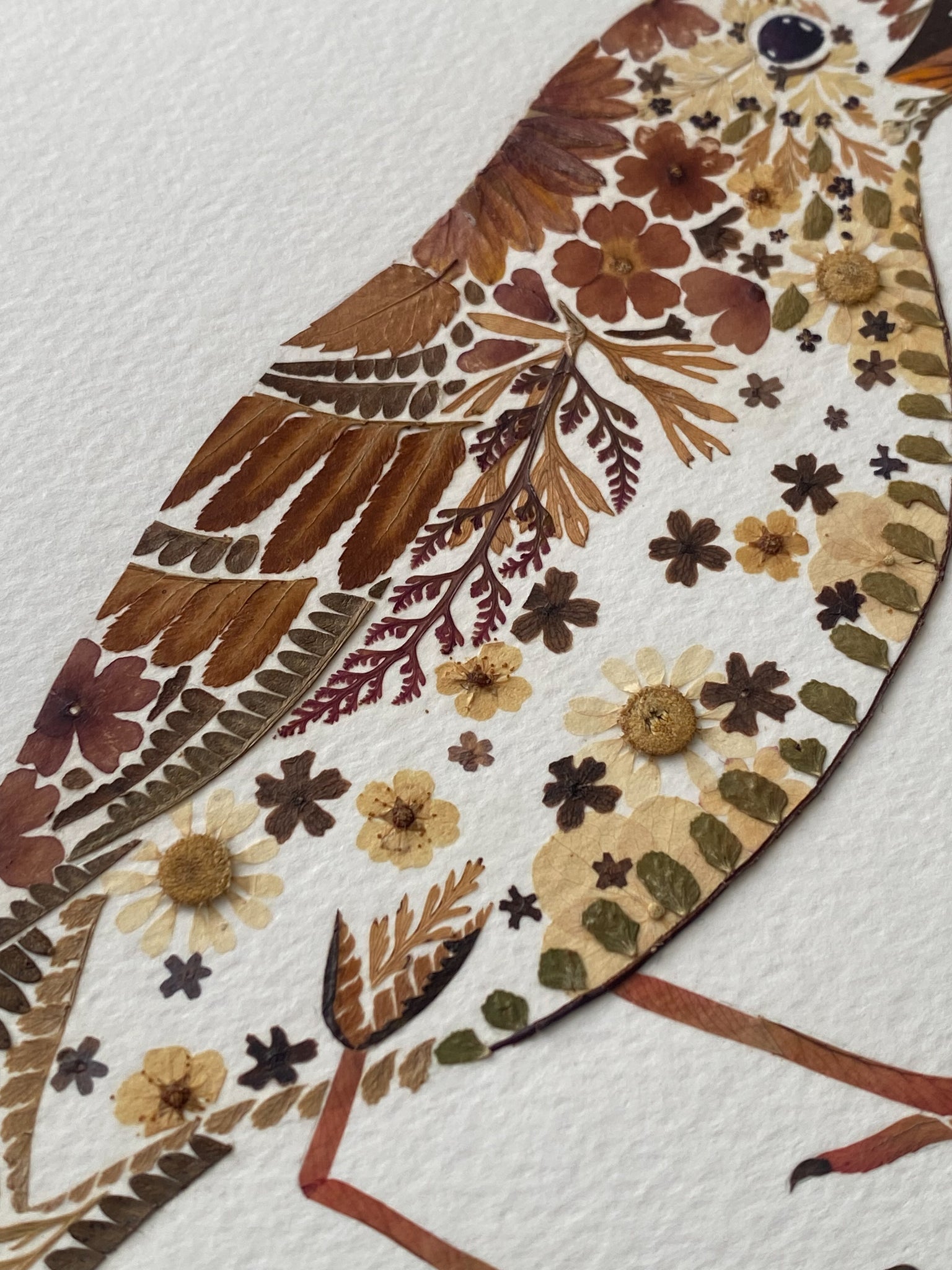 A sweet medium sized mistle thrush made with leaves and flowers in shades of brown and cream. Plants include fern, verbena, chamomile, california poppy, leaves and more.